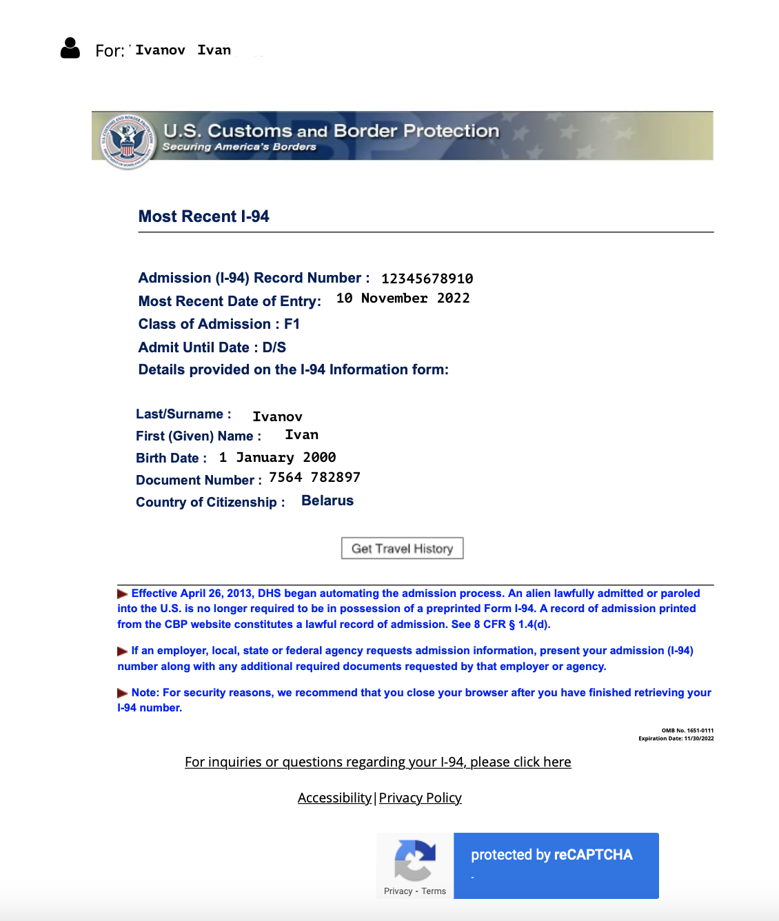 Форма I-94 содержит 11-значный номер, который уникален для каждого путешественника.